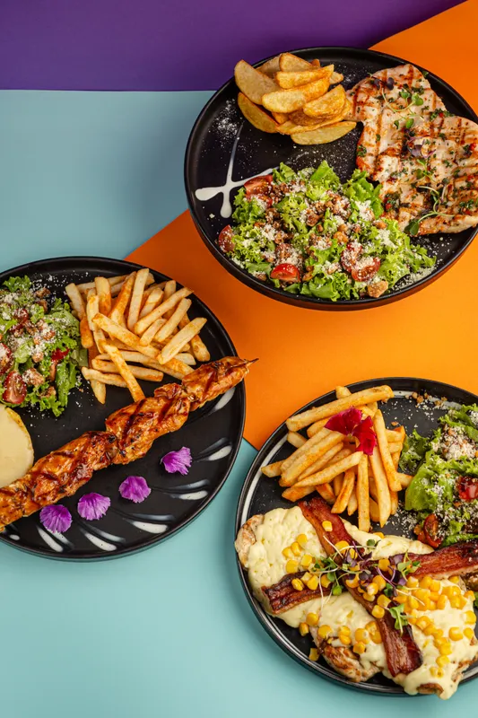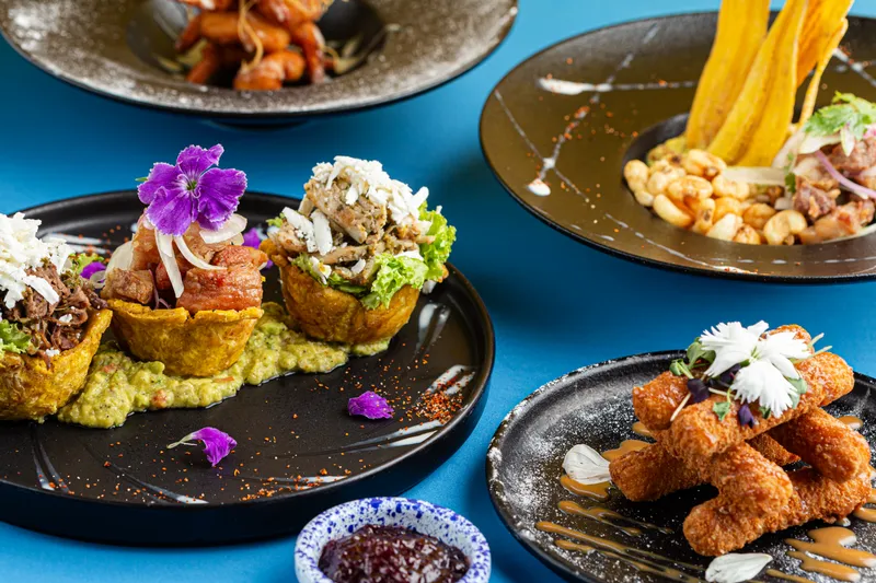 Papas francesas artesanales, julianas de cerdo y res, chorizo artesanal, maíz dulce, salsa de queso cheddar, salsa de la casa, bbq, queso costeño.